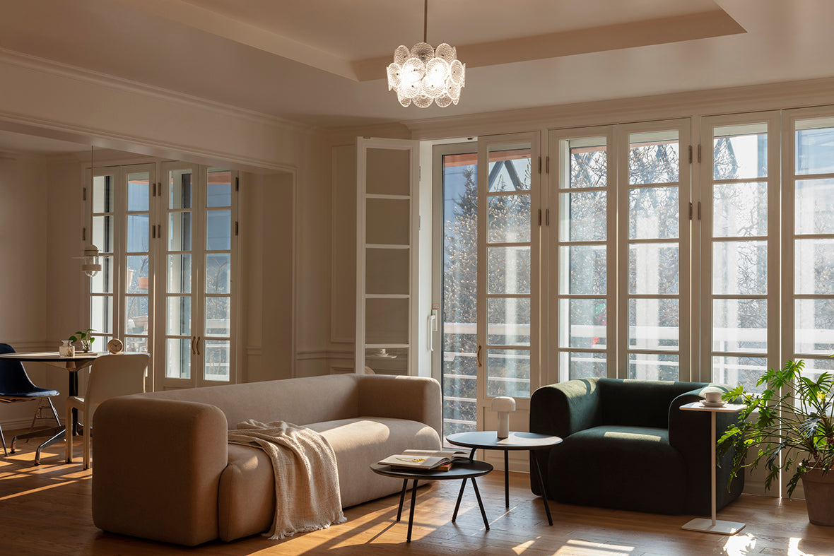 Mass Sofa は、一本のラインでつながっているかのような有機的なシルエットが特徴です。丸みを帯びたアームとカーブを描くシートが視覚的な心地よさを与え、シンプルで節度あるデザインが空間に落ち着きをもたらします。