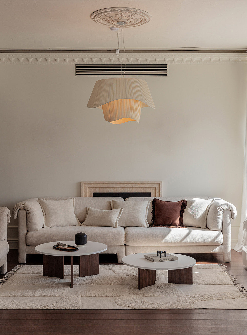 クッション性のあるファブリックを重ねることで、立体的で豊かなディテールを生み出し、ふくらみのあるシルエットとともに心地よい空間を演出します。