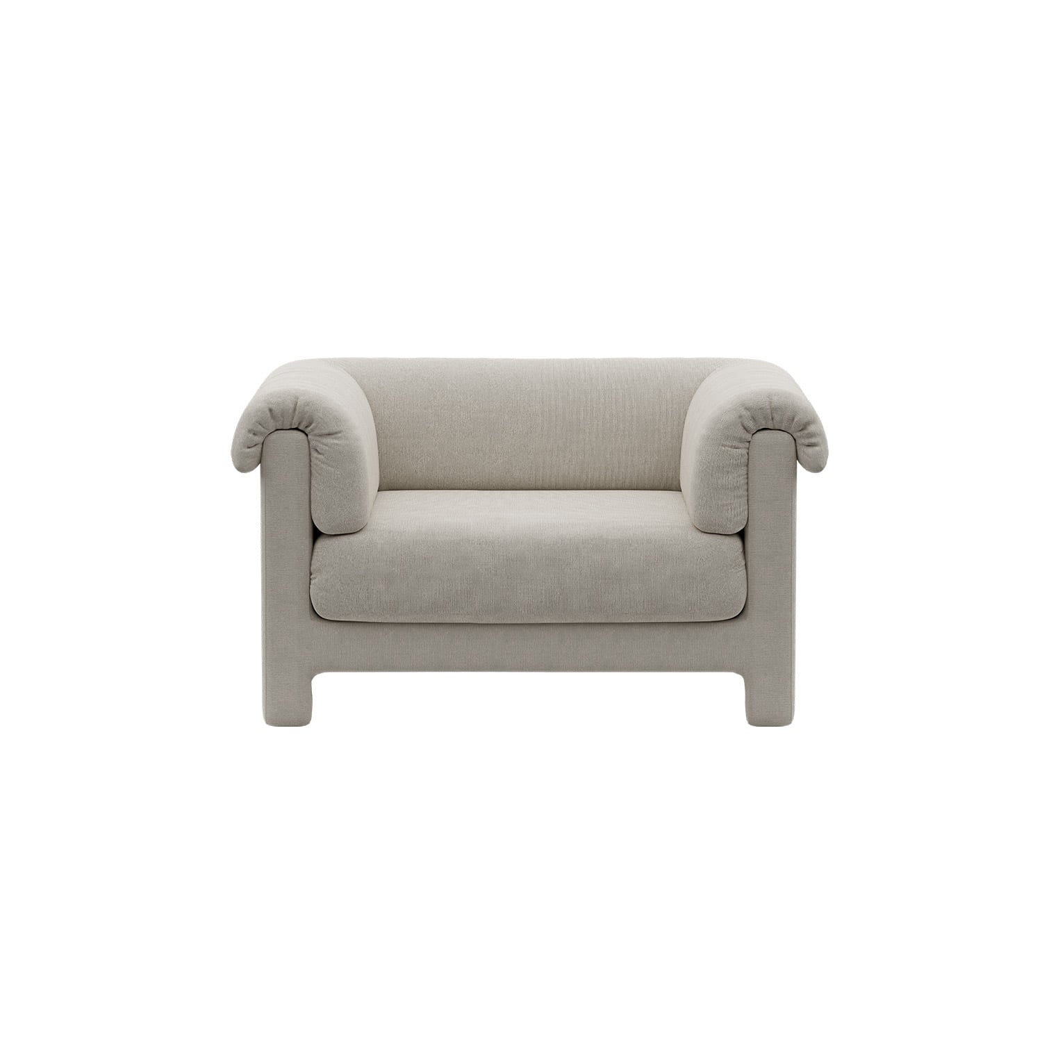一体型背もたれ兼肘掛けはグース充填材で、よりボリューム感のあるシルエットと快適な着座感を提供します。